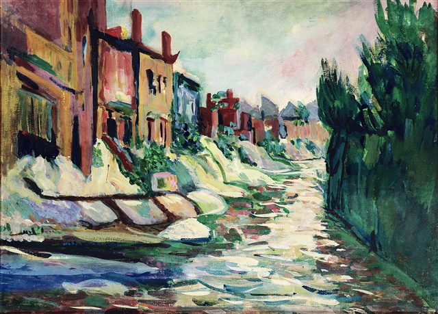 畢竟打從我透過北美館的[台灣紀行]典藏圖錄,認識台灣前輩畫家諸如郭雪湖 倪蔣懷 馬白水 廖繼春等人的台灣美景以來,印象一直都是以莫內 雷諾瓦 梵谷等人的印象派為主,很少看到野獸派的作品,唯一的例外就是立體派的代表作-許武勇的[迪化街].而這件吳耀忠的[三峽]顛覆了我記憶中台灣畫家筆下的台灣美景,就是印象派的認知,也發現了原來台灣美景,也可以大膽用色,華麗野獸派一下!