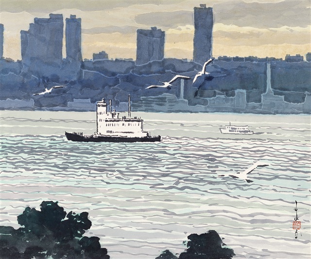 夏天的淡水,有一種藍天與水景,合而為一的一種氣氛,大片的藍色讓人暫時忘記了大海與天空的分界線,沉浸在夏季藍色的氣氛中,這樣的氣氛讓我想了馬白水的一件作品[哈德遜河風光].